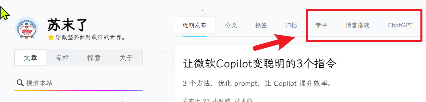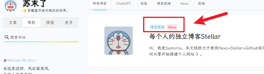 _config.stellar.yml 1 2 3 4 5 6 7 8 9 10 # 顶部检索栏 post-index : # 近期发布 分类 标签 归档 and ... "专栏" : /wiki/ "博客搭建" : /wiki/ Hexo /xx.html index_blog : nav_tabs : # 近期发布 分类 标签 专栏 归档 and ... "留言" : /about/ #comments #点击到网页复制路径